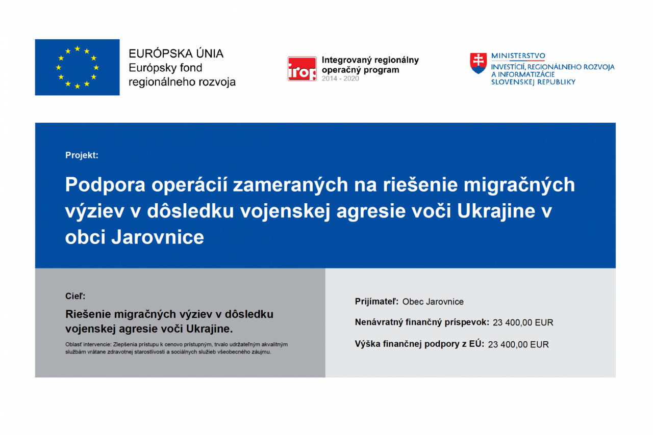 Obec Jarovnice bola úspešná vo výzve IROP-PO9-SC91-2023-108 - Podpora operácií zameraných na riešenie migračných výziev v dôsledku vojenskej agresie voči Ukrajine a získala nenávratný finančný príspevok vo výške 23 400, 00 Eur.